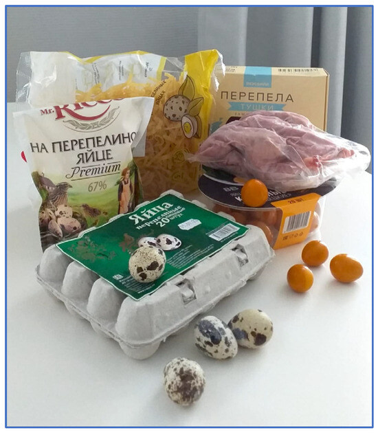 Japanese quail [Coturnix japonica (CJA) Temminck and Schlegel, 1848] products (Figure 1) occupy a strong position in the overall market assortment of food products provided by the livestock industry. Both quail eggs and meat are in great demand among the worldwide population [1,2,3,4,5]. Quail meat is a dietary product characterized by high nutritional value and good taste. Quail meat contains a small amount of fat (3–4%) and a significant proportion of proteins (20%). In terms of vitamin and mineral content, quail meat is superior to the meat of broiler chickens [6,7,8,9].