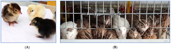 Quails of the F2 reference population: (A) at 3 days of age and (B) at 7 weeks of age.