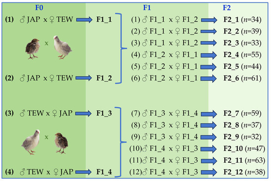 This study assessed a total of 146 males of an F2 reference population (Figure 2) produced by crossing the following two parent breeds [43]: (1) JAP, a slow-growing breed of layer (lighter) type, and (2) TEW, a fast-growing breed of meat (heavier) type (Table 1). At the first stage, four families were formed, each of which included one male and five females of the original breeds, JAP and TEW, to perform their reciprocal crosses according to the experimental design presented in Figure 3. Individuals of the grandparent stock were not related and were mated to produce the following families: F0_1 and F0_2 (each included one JAP male and five TEW females) and F0_3 and F0_4 (each consisted of one TEW male and five JAP females). From each family, 20–30 F1 progenies were obtained and used to generate the F2 reference population. For this purpose, we selected 12 F1 families (F1_1 to F1_12) consisting of one male and three females that were not close relatives. As a result of mating these F1 individuals, F2 offspring were produced (groups F2_1 to F2_12, n = 542), and 146 F2 males were chosen for further research (groups F2_1 to F2_6, n = 72; and F2_7 to F2_12, n = 74). Thus, the original parent breeds made an equal contribution to the formation of the experimental population of F2 quails used in this study for the GWAS analysis of meat traits.
