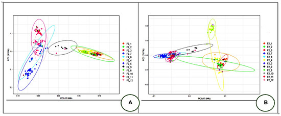The PCA output revealed the distribution of the studied F2 reference population into four main clusters. The first principal component (PC1) was responsible for 17.64% of the genetic variability, and the second principal component (PC2) explained 9.53% of the genetic variability. Herewith, the groups F2_1 to F2_12 were differentiated into three subgroups as follows: (1) F2_1, F2_2, F2_3, F2_4, and F2_6; (2) F2_5, F2_7, F2_8, F2_10, F2_11, and F2_12; and (3) F2_9. Using PC1 and the third principal component (PC3; 7.67% of the genetic variability), these groups were divided into the following three subgroups: (1) F2_7, F2_5, F2_8, F2_9, F2_10, F2_11, and F2_12; (2) F2_1, F2_2, F2_3, and F2_4; and (3) F2_6, the latter being evenly distant from subgroups 1 and 2. This stratification information is presented in Figure 4.