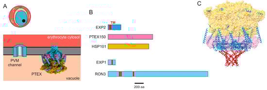 The molecular determinants of the protein export translocon were uncovered through a proteomic approach that capitalized on the above findings. Recognizing that an ATP-dependent chaperone is likely involved, de Koning-Ward et al. examined the detergent-resistant membrane proteome of immature infected cells to identify HSP101, a ClpA/B-like AAA + ATPase chaperone protein [121]. Immunoprecipitation experiments were then used to identify associated proteins, PTEX150, EXP2, PTEX88, and TRX2. The interactions between these proteins were confirmed through reciprocal pull-down experiments. Importantly, this complex, termed the Plasmodium Translocon of EXported proteins (PTEX), was then shown to interact with exported proteins containing the PEXEL motif through mass spectrometry studies, providing compelling evidence for its role as a translocon. Based on biochemical studies showing that EXP2 is integral to membranes and that it has structural homology to pore-forming hemolysin E, EXP2 was proposed to be the pore-forming subunit of the putative translocon in this foundational study [121].
