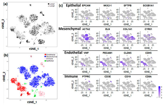 Identification of lung major cell types using single−cell RNA sequencing of newborn human lung. (a) t−Distributed Stochastic Neighbor Embedding (tSNE) analysis of cells. Cells are indicated by donor (lung 1: GAB 39 weeks; lung 2: GAB 31 weeks; GAB: Gestational Age at Birth). (b) The assignment of cell clusters to four major cell types, including endothelial cells, mesenchymal cells, immune cells, and epithelial cells. (c) Expression of some known cell type markers.