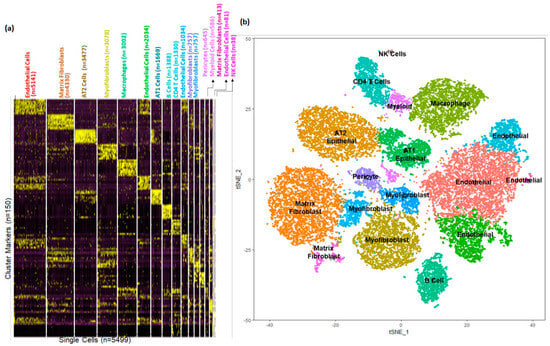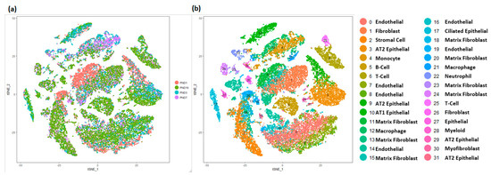 Unfractionated dissociated cells from each subject were rapidly thawed and, without resting, used for two separate captures of single cells for RNAseq. For each lung, one capture was preceded by removal of dead or dying cells through magnetic selection using a Dead Cell Removal Kit (Miltenyi Biotech, Santa Barbara, CA, USA). Cell capture and library production was performed on the Chromium 10X Genomics system (v2 chemistry). Sequencing was performed on a HiSeq4000, with read alignment to GRCh38. Cells filtered to exclude low quality cells, and potential doublets, were used to create analytical dataset. Highly variable genes were identified using “FindVariableGenes” function in Seurat [41]. Principal component analysis (PCA) was used for dimension reduction based on only the highly variable genes. Top principal components (PCs) identified by JackStrawPlot() and graph-based Louvain-Jaccard methods [42] were used for t-Distributed Stochastic Neighbor Embedding (tSNE) and clustering analysis. All single-cell sequencing data analysis was performed using Seurat v2.4 [43,44]. Cluster markers were defined by differential expression using a parametric Wilcoxon rank sum test at a corrected significance level of p < 0.05 and upregulated the cluster compared to all other cells using the FindAllMarkers() command implemented in Seurat. Pathway analysis and cell type association was performed using ToppGene Functional Annotation tool (ToppFun) [45]. The human cell sequencing counts data is available for visualization and downloading through the LungMAP portal (https://lungmap.net/breath-omics-experiment-page/?experimentTypeId=LMXT0000000016&experimentId=LMEX0000004390&analysisId=LMAN0000000347&view=entitySet; accessed on 1 February 2024).