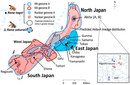 - Eto, K.; Matsui, M. Cytonuclear discordance and historical demography of two brown frogs, Rana tagoi and R. sakurai (Amphibia: Ranidae). Mol. Phylogenet. Evol. 2014, 79C, 231–239. [Google Scholar] [CrossRef]