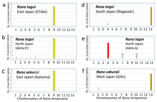 - Kuwana, C.; Fujita, H.; Tagami, M.; Matsuo, T.; Miura, I. Evolution of Sex Chromosome Heteromorphy in Geographic Populations of the Japanese Tago’s Brown Frog Complex. Cytogenet. Genome Res. 2021, 161, 23–31. [Google Scholar] [CrossRef]