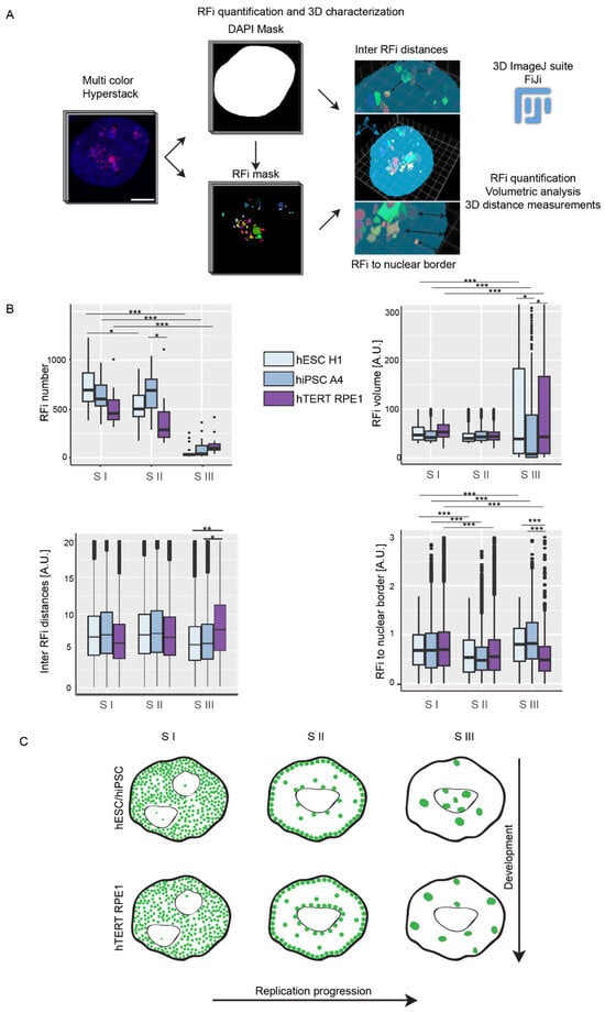 Moving forward, we proceeded to quantify and characterize RFi during different S phases and across various cell lines. We acquired multicolor images in 3D using confocal laser scanning microscope in 100× objective with Z interval of 300 nm (voxel size = 0.125 × 0.125 × 0.29) with enough Z planes to cover the whole nucleus typically between 20–35 stacks. Leveraging the 3D confocal data, we performed segmentation of the RFi, quantified the number of RFi in each S phase, and extracted volumetric and spatial features of the RFi (Figure 2A and Figure S1B). Across all cell lines, the number of RFi was notably higher in S I, exhibited a slight reduction in S II (except hiPSC), and dropped significantly in S III. The volume of the RFi was comparable in S I and S II, but it increased in S III (Figure 2B). Upon comparing the number of RFi among different cell lines, a distinctive pattern emerged. Pluripotent stem cells exhibited a higher number of RFi during both S I and S II phases, with a slight decrease in S III, in comparison to somatic cells. This observation suggests a variable regulation of DNA synthesis in pluripotent stem cells relative to somatic cells, indicative of developmental differences in DNA replication dynamics. Both, pluripotent as well as somatic cells decreased the numbers of RFi in the late S phase S III.