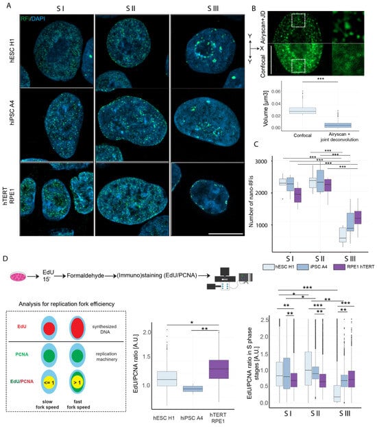 We utilized Airyscan SR, in conjunction with Airyscan joint deconvolution (ASJD), to acquire super-resolved multicolor images in 3D (Figure 3A). A comparative analysis of a specific nuclear region with RFi obtained on the same system, first in confocal mode and then in ASJD mode, demonstrates a significant enhancement in resolution, allowing the discernment of nano-scale RFi or replicons (Figure 3B). We observed that the volume of the segmented RFi from confocal images was 4–5 times higher compared to super-resolution imaging (ASJD) (Figure 3B, plot). Hereafter, we refer to the latter as “nano-RFi” and the former as RFi. Through segmentation and quantification, we determined the number of nano-RFi in each S phase and cell line. In general, we observed a 4–5 times increase in the number of nano-RFi compared to confocal microscopy (compare Figure 2B to Figure 3C). During the early S phase, a similar observation of nano-RFi numbers was noted, where pluripotent cells exhibited a higher count of replication origins firing in S I (Figure 3C). In contrast to the confocal data, where RFi numbers were lower in S II compared to S I, we observed a gain in nano-RFi numbers. The total number of active origins was found to be highest in S II across cell lines. Interestingly, nano-RFi numbers were comparable among pluripotent and somatic cells during this phase. In S III, mirroring our earlier observation (Figure 2B), nano-RFi counts were higher in somatic cells than in pluripotent cells.