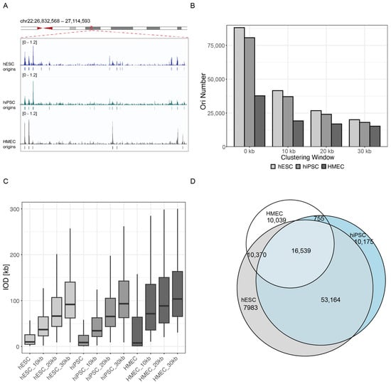 Genome-wide replication origins distribution in selected human cell lines based on the SNS-seq origin mapping method. (A) Representative example of replication origins distribution in hESC, hiPSC, and HMEC. The origin profiles correspond to normalized read counts (scale 0–0.7 counts per million). Below the profiles, the origins identified by MACS2 peak callers are shown. (B) Comparison of the origin numbers in the human embryonic cell line (hESC), induced pluripotent cells (hiPSC), and the somatic HMEC cell line. Additionally, for the total identified peaks, the graph represents the origin number after clustering of closely situated origins at the distances of 10, 20, and 30 kb. (C) Comparison of the inter-origin distances (IOD). The IOD distances were also compared after origin clustering at the distances specified. The statistical evaluation of IODs between different cell lines and same clustering distance were significant (p-value < 0.001) with the only exception of the difference between ESC and iPSC, which was not significant p-value = 0.4125770. For more details see Table S4. (D) Overlap of peaks among the different cell lines.