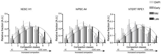 In recent years, various microscopy tools have been employed to dissect chromosome territories (CT) and the fundamental units of CT, known as chromatin domains (CD) [32,33]. The functional nuclear organization is characterized by two spatially co-aligned compartments: the active nuclear compartment (ANC) and the inactive nuclear compartment (INC). The INC consists of compacted portions of chromatin domain clusters (CDCs), or CDC core, which are transcriptionally incompetent and enriched in repressive histone marks. Meanwhile, the ANC encompasses the interchromatin compartment (IC), a largely chromatin-devoid and decondensed region that is transcriptionally competent, serving as the periphery of chromatin domain clusters or the perichromatin region (PR). Using a combined approach of highly resolved microscopy and statistical image analysis, individual nuclei can be subdivided into different DNA compaction classes. We employed the Nucim tool, available on the statistical analysis platform R, which utilizes a hidden Markov random field model to assign each voxel to different compaction classes based on DAPI intensity [24,34]. Notably, this approach is not constrained by staining variations that may arise from different samples and considers individual nuclei (refer to Figure S2A). Subsequently, we segmented and mapped replication foci (RFi) to individual compaction classes using an intensity-weighted threshold method across different S phase stages. In hiPSC A4, we observed a distinct compaction class distribution compared to hTERT RPE1, with a higher fraction of chromatin in the interchromatin compartment (IC) and less in the inactive nuclear compartment (INC), while the active nuclear compartment (ANC) fraction remained comparable (Figure 5). Following the mapping of RFi to compaction classes, hiPSC A4 displayed a similar distribution in S I and S II, with a majority of RFi mapped to IC or PR. In hTERT RPE1, three distinct distribution patterns emerged: S I was more present in classes 2, 3, and 4, (ANC) while S II was enriched in classes 4, 5, and 6 (a fraction in INC). In both cell types, RFi from S III were mapped to INC, represented by classes 5, 6, and 7 (Figure 5).