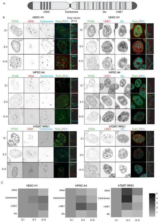 Replication timing of genomic repeat elements. (A) Schematic representation of a chromosome with the tandem and interspersed repeat sequences color-coded. (B) The co-detection of two combinations of probes across cell lines as indicated (red and cyan) with PCNA (green). The line plots depict the fluorescence intensity distribution of the PCNA and the probes along the line (in microns) drawn on the merged image. (C) Heat plot shows the fold change in the sum intensity of each probe replicated in the S phase stages as indicated. The sum intensity of each probe was measured using the segmented RFi as masks in each S phase stage in individual cells and normalized to the median sum intensity of S I for each probe and cell line. For details, see Figure S1B and Table S5. Scale bar: 10 µm.