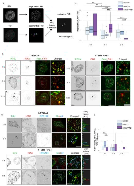 In the case of rDNA replication, a more detailed and nuanced pattern emerged. While in hTERT RPE1, the rDNA replication timing was more defined, and we observed a large fraction replicating in S II, we did not find any specific S phase stage where most of the rDNA replicated in hiPSC A4. When employing the conventional approach of segmenting all probe signals, we encountered limitations, particularly when only a small fraction of repeats were replicating simultaneously. To overcome this, we employed a direct approach, separately segmenting rDNA and RFi signals and performing an “AND” mathematical operation (Figure 7A). This method revealed a switch in rDNA replication timing in hESC H1, hiPSC A4, and hTERT RPE1. While a significant portion of rDNA initiated replication in S I in all cell lines, in hTERT RPE1, the remaining rDNA underwent replication in S II (Figure 6C), consistent with prior findings from mouse models [39]. However, in PSCs, the replication timing of rDNA was delayed, with the remaining repeats replicating in S III and some marking the end of the S phase (Figure 7B,C). We further validated this observation in hESC H1 using repli-FISH coupled with the “AND” analysis approach (Figure S6A). This comprehensive approach provided valuable insights into the dynamics of replication timing for genomic elements that do not replicate in one particular S phase and provided increased temporal resolution.