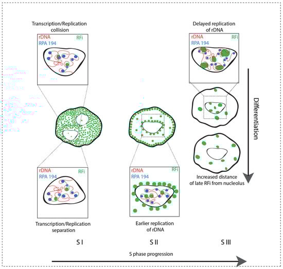 Moreover, we dissected in detail the replication timing of rDNA and its change upon differentiation. While in the Xenopus egg system, the rDNA replicates later than the rest of the genome, in mouse embryonic fibroblasts, the rDNA repeats replicate in two waves, with 40% open rDNA replicating early and the rest compacted rDNA later in the S phase [39,47]. We observed a similar trend in human cells. Both somatic and hPSC replicate a fraction of the rDNA repeats in S I. Whereas, in hPSC, the rest of the tandem repeats replicate late in the S III, these replicate earlier in S II in somatic cells. Furthermore, we analyzed the nature of early- or late-replicating rDNA using RPA 194 as a marker for active transcription [41]. We found a general separation between replication and transcription at rDNA repeats in line with earlier observations [43]. However, the early-replicating rDNA tends to be also transcriptionally active, suggesting an increased risk of transcription–replication collision arising by the activation of replication in hPSC. Altogether, our model in Figure 8 complements and expands our understanding of the developmentally regulated genome replication program in human cells.