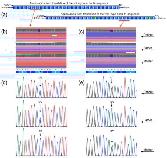 Next-generation sequencing results for observed variants in UNC5C gene. (a) Amino acid sequences corresponding to translation of DNA sequences from exon 11 and exon 14. Horizontal arrows above amino acidic sequences indicate NH2 → COOH direction. Modified from UCSC Genome Browser (http://genome.ucsc.edu, accessed on 2 February 2024). (b) Variant p.G806A and (c) variant p.C594Y detected by means of whole-exome sequencing (WES) of patient, father, and mother. Images were obtained by Integrative Genome Viewer (IGV). Asterisks, in the amino acid sequences, indicate mutated amino acids in UNC5C gene of subjects. (d,e) Variant confirmation through Sanger sequencing for both variants: p.G806A and p.C594Y. Two genotypic variants for each subject indicated in electropherograms. In the electropherograms, black, blue, green, and red profiles indicate G, C, A, and T nucleotide, respectively.