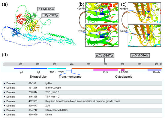 UNC5C wild-type protein and mutated forms. (a) Predicted protein structure of UNC5C using UCSF ChimeraX v.1.7 molecular modeling system. (b,c) Distinctions between wild-type (above) and mutated (below) amino acidic structures. Specifically, in (b), cysteine was replaced by hydrophobic amino acid tyrosine, resulting in a reduction of one hydrogen bond (from 2 to 1). Arrows indicate the position of the involved amino acids. (d) Functional domains within UNC5C protein, with affected domains by both identified mutations being ZU5 (530–673 aa) and region crucial for netrin-mediated axon repulsion of neuronal growth cones (402–931 aa).