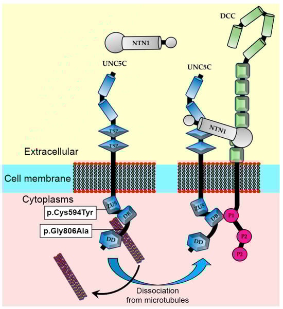 As previously mentioned, in silico analysis performed by various algorithms demonstrated that neither variant observed affected the allosteric linkage between UNC5C and NTN1 (Table 2). In fact, these mutations were located within crucial cytoplasmic domains, specifically ZU5 and the region required for the netrin-mediated repulsion of neuronal grown cones. These domains play a critical role in forming the supramodular protein structure and directly interact with microtubules, ensuring the functionality of the axon repulsion process [32,33,34,35].
