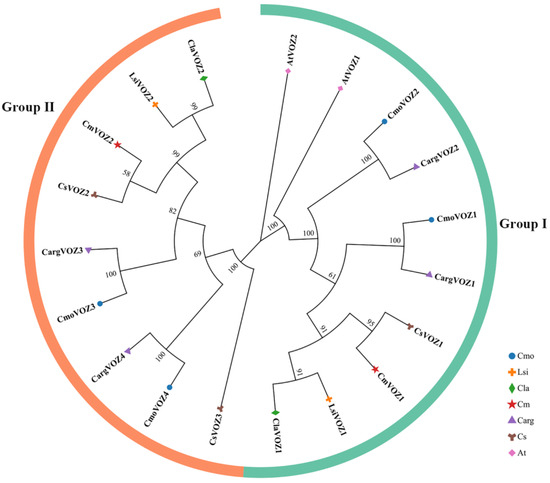 Phylogenetic relationships of VOZ proteins in winter squash (Cmo), cucumber (Cs), melon (Cm), bottle gourd (Lsi), silver-seed gourd (Carg), watermelon (Cla), and Arabidopsis (At). All VOZ proteins in the seven species were divided into two groups, with the I and II groups shown in green and orange, respectively. The phylogenetic tree included 2 AtVOZ, 4 CmoVOZ, 3 CsVOZ, 2 CmVOZ, 2 LsiVOZ, 4 CargVOZ, and 2 ClaVOZ proteins.