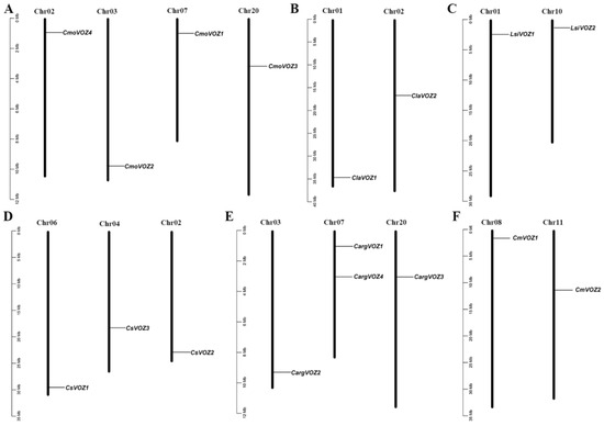 Mapping of the VOZ genes on the chromosomes of six Cucurbitaceae species. (A) CmoVOZ genes in the chromosome of winter body squash. (B) ClaVOZ gene in the chromosome of watermelon. (C) LsiVOZ gene in the chromosome of gourd. (D) CsVOZ gene in the chromosome of cucumber. (E) CargVOZ gene in the chromosome of silver-seed pumpkin. (F) CmVOZ gene in the chromosome of melon. The number of chromosomes is marked at the top of each chromosome. The left scale is the length of the chromosome, and the reported scale is in megabases.
