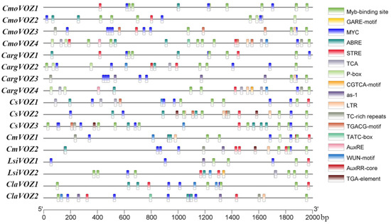Analysis of cis-acting elements in the promoter region of the VOZ gene. The names of the VOZ genes of silver-seed gourd (CargVOZ), watermelon (CliVOZ), cucumber (CsVOZ), winter squash (CmoVOZ), bottle gourd (LsiVOZ), and melon (CmVOZ) are listed on the left. Different color boxes represented various types of cis-elements.