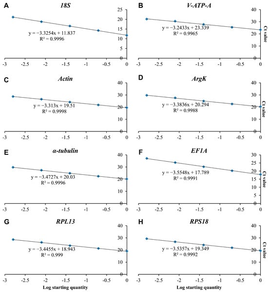 Standard curves of the eight candidate reference genes: (A) 18S, (B) V-ATP-A, (C) Actin, (D) ArgK, (E) α-tubulin, (F) EF1A, (G) RPL13 and (H) RPS18.