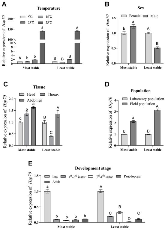 Relative expression of Hsp70 under different experimental conditions. (A) The relative expression of Hsp70 under different temperature treatment conditions was normalized by selecting the most stable (RPS18 and RPL13) and least stable (V-ATP-A and Actin) reference genes. (B) For sex comparisons, the relative expression of Hsp70 was calculated using the best reference genes (α-tubulin, 18S and V-ATP-A) and the worst reference genes (EF1A, Actin and ArgK) and normalized. (C) The relative expression of Hsp70 in different tissues was normalized to the expression of the optimal genes (EF1A and α-tubulin) and the worst genes (RPS18 and Actin), respectively. (D) Relative expression of Hsp70 was normalized to the relative expression of the optimal genes (Actin and ArgK) and the worst genes (α-tubulin and EF1A) under different population conditions. (E) Relative expression of Hsp70 at different developmental stages was best normalized to the expression of the optimal reference genes (V-ATP-A and RPS18) and the worst reference genes (ArgK and Actin). Values are means ± standard error. Different lowercase letters indicate significant differences from the most stable gene (p < 0.05). Different uppercase letters indicate significant differences when normalized to the least stable (p < 0.05).
