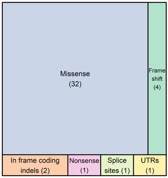 In the 25 probands/families tested here, a total of 41 different non-synonymous DNA variants were recorded in 26 genes. The types of genetic variants detected are the following: thirty-two (78%) missense variants, one (2.4%) nonsense variant, four (9.8%) rameshift variants resulting in premature termination codons, two (4.9%) in frame coding indels, one (2.4%) variant affecting the consensus splice site nucleotides, and one (2.4%) variant in the first nucleotide of the 3′-UTR (Figure 1).