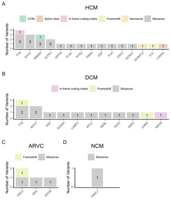 The variant types per gene in the four categories of cardiomyopathy. (A) Hypertrophic cardiomyopathy (HCM), (B) dilated cardiomyopathy (DCM), (C) arrhythmogenic right ventricular cardiomyopathy (ARVC), and (D) non-compaction cardiomyopathy (NCM).
