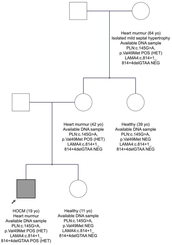 In family FAM10 with the HCM diagnosis, we found two candidate variants, one in the LAMA4 gene and another one in the PLN gene, in the proband’s sample. The LAMA4 gene, which encodes the laminin α4 chain, is an essential component of the extracellular matrix laminin-8 and -9 and has structural and signalling roles []. However, mutations in the LAMA4 gene have been identified in patients with DCM []. The PLN gene encodes phospholamban that regulates the sarcoplasmic reticulum Ca2+-ATPase (SERCA), which transports calcium from the cytosol into the sarcoplasmic reticulum []. Mutations in the PLN gene are implicated in HCM []. The LAMA4 variant was a four-nucleotide deletion encompassing the consensus donor splice sequence in intron 7 (LAMA4:c.814+1_814+4delGTAA). This variant is very rare in the gnomAD Exomes database, as well as in the Cypriot population, 0.0009 (1/1111). The professional HGMD database does not report the variant, whereas Franklin characterizes it as VUS to likely pathogenic. The second variant, PLN:c.145G>A, p.Val49Met (in exon 2), had a very low MAF score in the international population databases and it has not been detected in the Cypriot population. In addition, it is characterized as a disease-causing variant for HCM by the HGMD professional database. Specifically, the variant was first reported in a study by Xu J et al. and was found in one HCM patient []. Franklin characterizes it as VUS to likely pathogenic. The FAM10 family segregation is shown in Figure 3. The proband is the only person who has inherited the two variants in the LAMA4 and PLN genes. At the age of 19, he was diagnosed with a heart murmur and hypertrophic obstructive cardiomyopathy (HOCM). On the other hand, his mother, aged 42, carries only the variant in the PLN gene and has a heart murmur. His grandmother at age 64 years, who also carries the variant in the PLN gene, has isolated mild septal hypertrophy and heart murmur. Hence, we suggest that the proband has a more severe phenotype than the other family members, perhaps due to the co-inheritance of the two variants. As the family data are not strong enough, the possibility remains that there is digenic inheritance, although not conclusively confirmed. Therefore, the LAMA4 variant remains as a VUS waiting for stronger evidence.