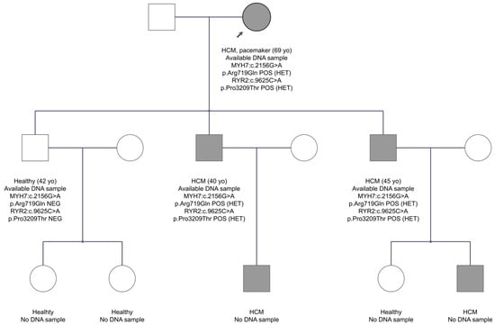 In family FAM11 with the HCM diagnosis, two variants were identified in the MYH7 and RYR2 genes in the proband’s DNA. The MYH7 gene is one of the two genes most commonly implicated in HCM. RYR2 gene, which encodes the cardiac ryanodine receptor 2, a channel located on the sarcoplasmic reticulum that controls calcium release for myocardium contraction, is recently considered a causal gene for HCM []. The MYH7 gene variant, exon 19, is c.2156G>A, p.Arg719Gln. It was not reported before in the gnomAD Exomes database, neither was it found in 1100 individuals of the Cypriot population. The HGMD database characterizes the variant as a disease-causing mutation for the development of hypertrophic cardiomyopathy. Several publications support this variant as pathogenic for HCM. In addition, the Franklin and ClinVar databases classify it as pathogenic. The second variant (c.9625C>A, p.Pro3209Thr) was in exon 68 of the RYR2 gene, substituting proline with threonine at amino acid position 3209. The in-silico analysis shows that it is extremely rare in the gnomAD Exomes database, whereas the MAF score in the Cypriot general population is 0.004. Based on ACMG criteria, the Franklin database classifies it as VUS to likely pathogenic, and it has never been reported before in the HGMD professional database. Impressively, as shown in the pedigree of FAM11 (Figure 4), both variants co-segregate with the disease. Two sons of the proband, aged 40 and 45 years, have inherited both variants and have the disease, while a third son at age 42 years has inherited neither of the candidate variants and is healthy. These data support that the two variants may be responsible for the phenotype in this family.
