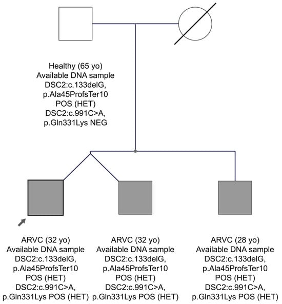 In family FAM24 with the ARVC diagnosis, two candidate pathogenic variants were found in the DSC2 gene in the proband’s sample. In general, the DSC2 gene, which encodes the desmocollin-2 protein of the desmosomes, is frequently implicated in ARVC []. The first variant is a frameshift in exon 2, DSC2:c.133delG, p.Ala45ProfsTer10, which has not been reported before in the gnomAD Exomes database or in the Cypriot population. The HGMD database characterizes it as a disease-causing mutation for the development of ARVC. Franklin characterizes it as likely pathogenic and it has not been reported before in ClinVar. The second variant in the DSC2 gene in exon 8 is c.991C>A, p.Gln331Lys. This variant has a MAF frequency in the Cypriot general population of 0.0004, whereas the international population databases do not report it. There is no report of the variant in both HGMD professional and ClinVar, whereas Franklin characterizes it as VUS. As shown in the pedigree of FAM24 (Figure 5), the proband aged 32 years, as well as his twin brother and younger brother aged 28 years, have inherited the two variants in the DSC2 gene and have ARVC. His father at age 65 years carries only the frameshift variant and is healthy. Therefore, we concluded that the phenotype observed in the three brothers may be caused by the co-inheritance of the two variants in the DSC2 gene, one from each parent, as an autosomal recessive condition. That the second variant, DSC2:c.991C>A, could have happened as a de novo event in the father’s sperm in cis to the first one and consequently he might be germinal mosaic remains as a very remote probability, considering the inheritance by three children.