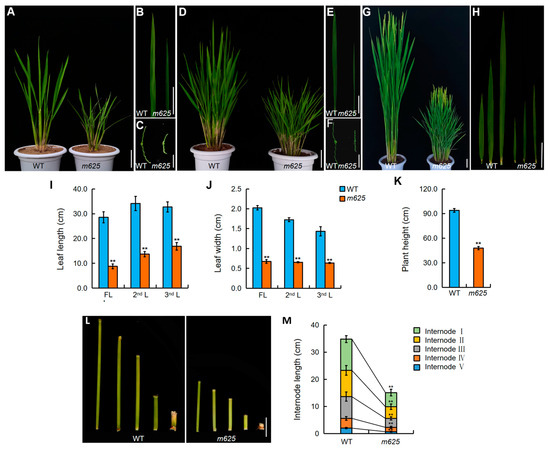 Phenotypic characterization of wild-type (WT) and m625. (A,D,G) Plant architecture at the tillering, elongation and heading stages, respectively. Scale bars, 5 cm. (B,E) Leaf morphology at the tillering and elongation stages, respectively. Scale bars, 5 cm. (C,F) Transverse section of the leaves at the tillering and elongation stages, respectively. Scale bars, 5 mm. (H) Morphology of the top three leaves at the heading stage. Scale bar, 5 cm. (I,J) Statistical analysis of the length and width of the top three leaves. Data are means ± SD (n = 24). The blue and orange columns represent WT and m625 in the histogram, respectively, the same as below. (K) Statistical analysis of plant height. Data are means ± SD (n = 24). (L) Characteristics of internodes (I–V) in WT and m625. Scale bar, 2 cm. (M) Quantification of WT and m625 internode length. Data are means ± SD (n = 9). Asterisks represent significant differences using Student’s t-test (** p < 0.01) in (I–K,M).