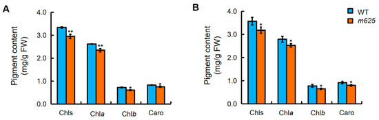 Pigment contents in leaves of WT and m625. (A) The levels of pigments in leaves at the seedling stage. (B) The levels of pigments in leaves at the booting stage. Chls, total chlorophyll; Chla, chlorophyll a; Chlb, chlorophyll b; Caro, carotenoids. Data are means ± SD (n = 9). Asterisks represent significant differences using Student’s t-test (* p < 0.05; ** p < 0.01).