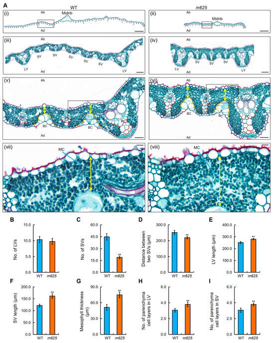 Cytological analysis of the leaf in WT and m625. (A) Transverse section of the leaf at the booting stage. (i,ii) Appearance comparison of the leaf. Red and black asterisks denote large vein (LV) and small vein (SV), respectively. (iii,iv) Comparison of LV number, SV number, and vein spacing. (iii) and (iv) are the zoomed-in images of black rectangles in (i) and (ii), respectively. (v,vi) Comparison of bulliform cells, mesophyll thickness, and number of parenchyma cell layers in veins. Orange curves outline the shape of bulliform cells. Yellow double-headed arrows represent mesophyll thickness. Red curves outline the parenchyma cell layers. (vii,viii) Enlarged images of mesophyll thickness. Blue arrows denote mesophyll cells. Ab, abaxial surface. Ad, adaxial surface; BC, bulliform cell; MC, mesophyll cell; PC, parenchyma cell. Scale bars, 1000 μm (i,ii); 100 μm (iii,vi); 50 μm (v,vi); 10 μm (vii,viii). (B–I) Numerical comparison of LV number, SV number, distance between two SVs, LV length, SV length, mesophyll thickness, and number of parenchyma cell layers in LVs and SVs. Data are means ± SD from five leaves. Asterisks represent significant differences using Student’s t-test (** p < 0.01).