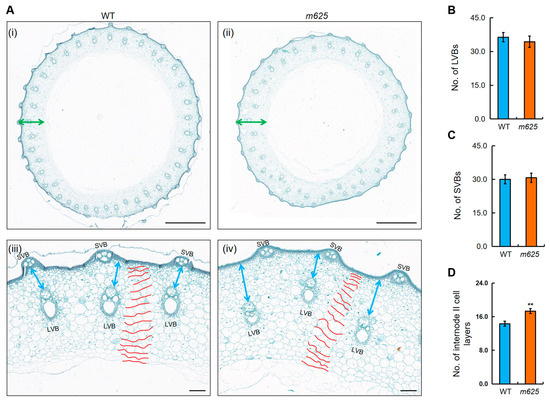 Cytological analysis of the stem in WT and m625. (A) Transverse section of internode II at the heading stage. (i,ii) Appearance comparison of internode II. Green double-headed arrows denote the internode thickness. (iii,iv) Zoomed-in images of transverse section. Blue double-headed arrows show the distance from the large vascular bundle to the outer ring. Red curves outline the internode II cell layers. LVB, large vascular bundle; SVB, small vascular bundle. Scale bars, 1000 μm (i,ii); 100 μm (iii,iv). (B–D) Numerical comparison of LVB number, SVB number, and cell layer number in internode II. Data are means ± SD from three biological replicates. Asterisks represent significant differences using Student’s t-test (** p < 0.01).