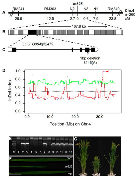 Gene cloning and function verification of m625. (A) The m625 gene was located in a 167.8 kb region between N2 and N3 on chromosome 4 using 260 homozygous F2 plants. (B) The 167.8 kb region contains 22 genes, and the candidate gene LOC_Os04g52479 was indicated with the black box. (C) The structure of LOC_Os04g52479 contains five exons and four introns. The black arrow represents a single nucleotide deletion at position 8146 bp in LOC_Os04g52479 in m625. (D) InDel index plots for m625 showed genetic linkage on chromosomes 4, in which a nucleotide deletion (InDel index value of 1.0) was found in 167.8 kb region. This deletion was positioned in the fourth exon region of LOC_Os04g52479, as indicated with the red triangles. (E) PCR identification of positive transgenic plants. M, DL-2000 marker; 1, m625 (negative control) 2, pC2300-M625 plasmid (positive control); 3–13, transgenic plants. (F) Leaf morphology in WT, m625, and TP (transgenic plants) at the booting stage. Scale bar, 5 cm. (G) Plant architecture of WT, m625, and TP during the grain filling stage. Scale bar, 10 cm.