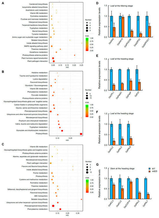 RNA-Seq and qRT-PCR analyses among WT and m625. (A) KEGG analysis of DEGs in the leaf at the tillering stage. (B) KEGG analysis of DEGs in the leaf at the heading stage. (C) KEGG analysis of DEGs in the stem at the heading stage. (D) Expression analysis of DEGs associated with IAA and ABA signal transduction in the leaf at the tillering stage. OsIAA2 and OsIAA15 are auxin-responsive Aux/IAA family genes; OsPP2C09, OsbZIP23, and OsSIPP2C1 are ABA signal regulator genes. (E) Expression analysis of DEGs associated with photosynthesis in the leaf at the heading stage. OsCPL1 is a plastocyanin gene; OsPsbS1 and OsPsbP are photosystem II genes; OsFd1 is a photosynthetic ferredoxin gene. (F,G) Expression analysis of DEGs associated with phenylpropanoid biosynthesis in the leaf and stem at the heading stage, respectively. Os4CL2, Os4CL3 and Os4CL5 are 4-Coumarate:Coenzyme A Ligase genes; OsCCR14 is a cinnamoyl-CoA reductase gene; OsPAL5, OsPAL6, and OsPAL7 are phenylalanine ammonia–lyase genes. Data in (D–G) are means ± SD from three biological replications. Asterisks represent significant differences using Student’s t-test (** p < 0.01).