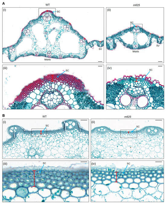The analysis of sclerenchyma in the leaf and stem between WT and m625. (A) Comparison of sclerenchyma in the leaf at the heading stage. (i,ii) Sclerenchyma thickness in the leaf. (iii,iv) Enlarged images of sclerenchyma in the midrib. Scale bars, 100 μm (i,ii); 20 μm (iii,iv). (B) Comparison of sclerenchyma in the internode II at the heading stage. (i,ii) Sclerenchyma thickness in the stem. (iii,iv) Enlarged images of sclerenchyma in the internode II. Scale bars, 50 μm (i,ii); 10 μm (iii,iv). In sections, the lignified cell walls were stained red by saffron O staining solution in the midrib of the leaf. Blue arrows denote sclerenchyma cell. Red markers indicate sclerenchyma thickness. SC, sclerenchyma cell.