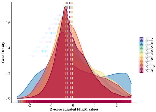 Density mapping of quantitative expression profiles across samples utilizing FPKM values. The horizontal axis of the map delineates the FPKM values that have been standardized through z-score adjustment, while the lateral axis corresponds to the gene density. Colored dashed lines within the figure denote the median FPKM values for the respective samples.