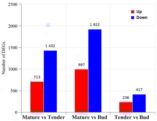 To elucidate the molecular mechanisms underlying M. kwangsiensis leaf development and differentiation, a comprehensive analysis of differential gene expression between developmental stages was performed (Figure 2). Comparing tender leaves against buds revealed 653 differentially expressed genes (DEGs) with 236 upregulated and 417 downregulated. More DEGs were observed between mature and tender leaves with 2145 DEGs identified. Within this dataset, 713 genes showed elevated expression (upregulated), and 1432 genes showed lowered expression (downregulated) in mature versus tender leaves (Figure 2). The substantial number of DEGs highlights the intricate genetic reprogramming during maturation.