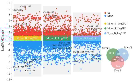 Volcano plots representing differentially expressed genes (DEGs) across three comparative groups in M. kwangsiensis. The groups are indicated as M (mature leaves), B (buds), and T (tender leaves). Red dots denote upregulated genes, while blue dots represent downregulated genes. The vertical axis reflects the log2 fold change (Log2FC) gene expression values. The Venn diagram classification of DEGs across the three groups is shown, highlighting the genes with the most significant variance common to all.