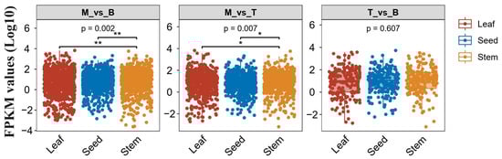 Probing the identified Arabidopsis orthologs in seed, stem, and leaf transcriptomic databases revealed consistent expression trends between the species with statistically robust differences (Figure 4). In M_vs_B and M_vs_T comparisons, Arabidopsis leaf expression proved markedly higher than stems (p < 0.01), which were in turn upregulated over seeds (p < 0.01). While T_vs_B followed the same pattern, differences lacked statistical power (Figure 4). Taken together, these results signify that Magnolia genes exhibiting pronounced expression shifts between leaf developmental states include ancient orthologous cohorts demonstrably active during Arabidopsis maturation—spotlighting core leaf development pathways conserved over vast evolutionary timescales between Magnoliids and Eudicots.