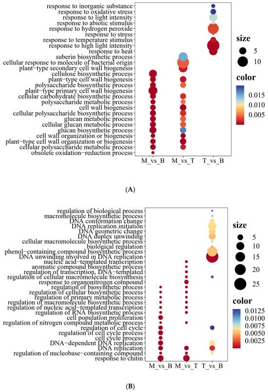 Gene Ontology (GO) functional enrichment analysis of upregulated and downregulated differentially expressed genes (DEGs) across three groups. The size of the points reflects the enrichment score, while the color indicates the p-value. (A) Enrichment analysis for upregulated genes. (B) Enrichment analysis for downregulated genes. The groups are indicated as M (mature leaves), B (buds), and T (tender leaves).