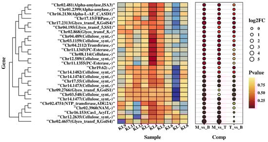 Gene expression profiles for 27 genes related to polysaccharides biosynthesis. The groups are indicated as M (Mature leaves), B (Buds), and T (Tender leaves). The heatmap on the left illustrates the relative expression levels of 27 genes associated with polysaccharide biosynthesis, as represented by FPKM values. The color intensity within each cell corresponds to the magnitude of the gene’s expression, with the scale indicating lower (blue) to higher (red) expression levels. On the left, hierarchical clustering is displayed based on z-score normalized FPKM values and utilizes Euclidean distance to groups. The bubble plot on the right side represents the Log2FC values. The size of each bubble indicates the magnitude of Log2FC, while the color denotes the statistical significance with the continuum ranging from non-significant (lighter) to highly significant p-values (darker).