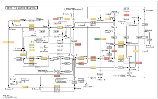The diagram of the starch and sucrose metabolism pathway (KEGG map00500). Nodes with upregulated genes are highlighted in red, while those downregulated are marked in green. Nodes colored in yellow indicate the presence of both upregulated and downregulated genes.