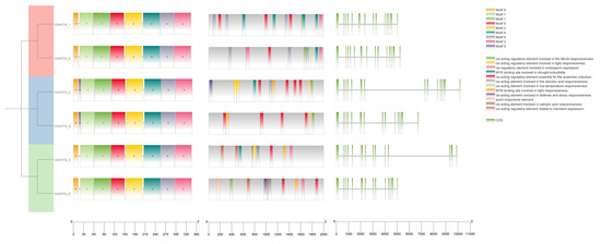 3.4. Examination of Gene Architecture, Protein Motifs, and Cis-Regulatory Elements