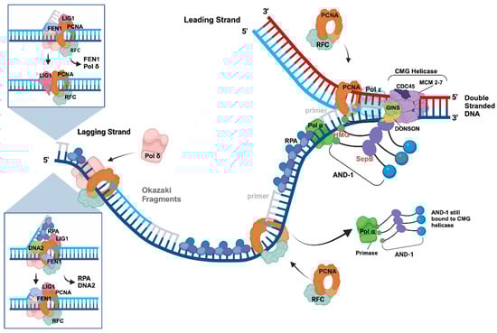 Leading and lagging strand synthesis at a eukaryotic replication fork. In this RF model, CMG helicase (CDC45-MCM2-7-GINS with CDC45, in dark blue, the MCM2-7 hexamer, in purple, and GINS, in light green) unwinds the parental dsDNA into the leading and lagging strand templates (dark-red and dark blue, respectively). The protein Donson associates with the CMG complex during its formation and remains attached to it during the unwinding reaction. Additionally, the diagram shows the replication proteins that are involved in DNA synthesis and the maturation of Okazaki fragments. As seen in the model, RPA heterotrimers (three shades of blue) bind to the unwound ssDNAs preventing hairpin formation and nuclease-dependent ssDNA degradation. RFC (blue) loads the PCNA ring (red brown) onto the primed template DNA. The latter stabilises Pol ε (light blue) on the template DNA when synthesising the leading strand (light blue DNA). Pol ε also associates with the CMG complex to support its unwinding activity, but this interaction might also be important during replication fork stalling (see Section 5). For lagging strand DNA synthesis, the AND-1/CTF4/WDHD1 homotrimer (named AND-1 in the diagram with one subunit consisting of an HMG (green), SepB (dark blue), and WD (blue) domain) links CMG to the Pol α complex (green). The primase function of Pol α synthesises the RNA primer (light grey), starting Okazaki fragment synthesis during lagging strand synthesis. After the initiation step, primase hands over the RNA primer to the DNA polymerase domain of Pol α on PolA1 (first polymerase transition). The latter extends the RNA primer and synthesises a short RNA–DNA fragment before leaving the template. RFC (blue) replaces Pol α with the help of RPA and loads PCNA, the DNA clamp, on the primed DNA. This RFC–PCNA complex allows Pol δ (pink) to associate with the RNA–DNA primer (2nd polymerase transition). The RFC–PCNA–Pol δ complex elongates this RNA–DNA in a processive manner until it reaches the next Okazaki fragment. Then, Pol δ slows down but continues to elongate the newly synthesised DNA. The polymerase displaces the RNA and parts of the Pol α-synthesised DNA of the Okazaki fragment in front (strand displacement). Thus, Pol δ produces an RNA-DNA flap, which is recognised and cleaved by PCNA-associated FEN1 (blue), creating a perfect product, nicked DNA, for LIG1 (top panel on the left; the two inserted panels provide insights into the different pathways of the Okazaki fragment maturation process). The DNA ligase LIG1, which is also bound to PCNA along with Pol δ and FEN1, then ligates the two DNA fragments, yielding a continuous stretch of DNA. In an alternate pathway, RPA binds the flap structure produced by Pol δ competing with FEN1 (lower inserted panel). RPA recruits the DNA2 helicase/endonuclease to the flap structure. The latter in turn cleaves the ssDNA but leaving an extra nucleotide remaining, which results in a product that LIG1 does not ligate. After RPA and DNA2 have left the DNA, FEN1 cuts off the remaining base and LIG1 ligates the two DNA fragments. Adapted from [2,32,61,67] and created with BioRender.com.