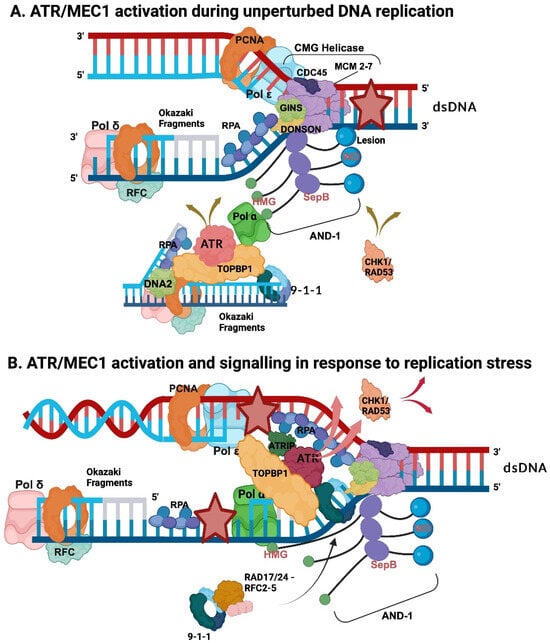 Signalling at unperturbed and perturbed replication forks. In these simplified RF models, ATR/MEC1 and CHK1/RAD53 initiate signalling pathways at RFs prior to and after passing damaged DNA resulting in stalled leading strand synthesis in the case of DNA damage, which is summarised in panels (A) and (B), respectively. In panel A, during normal, unperturbed replication processes at RFs, the Okazaki fragment synthesis on the lagging strand produces a signal via ATR/MEC1 (light red) and CHK1/RAD53 (dark pink) to slow down the RF by modulating, e.g., the CMG helicase, to synchronise DNA synthesis and nucleotide synthesis. This ATR/MEC1 activity requires Pol α and DNA2 (Okazaki fragment initiation and maturation) and signals unperturbed RFs [114,116]. When Pol ε on the leading strand encounters a DNA lesion (pink star) or is exposed to nucleotide depletion, the enzyme stops DNA synthesis and disengages with or modulates the CMG complex. Then, the latter continues to unwind DNA yielding stretches of ssDNA, which are boundby RPA. These RPA–ssDNA structures recruit ATRIP and ATR (dark red) to the leading strand, in addition to ATR’s binding via TOPBP1, its main activator, to the lagging strand with Pol α and 9-1-1 as partners (panel B). Additionally, the binding of Pol ε to TOPBP1, which may occur via a binding site of Pol ε to TOPBP1 hidden when associated with the CMG complex, may enhance this DDR signalling. It is important to note that Pol α and the RNA primer synthesis are key for the initiation of replication stress signals via ATR/MEC1 and that at RFs, Pol α does not synthesise RNA primers on the leading strand [34,72,73,117,118]. The brown, pink, and red arrows indicate ATR/MEC1 and CHK1/RAD53 signalling during unperturbed and perturbed DNA replication. This model suggests that ATR signalling requires multiple key partners located on both template strands of a stalled RF. It is important to mention that human and yeast CHK1 are homologues on the sequence level, whereas human CHK2 is the orthologue of yeast RAD53, but regarding the ATR pathway during replication stress, human CHK1 and RAD53 are functionally equivalent [119]. The figure was created with Bio Render using published results [32,72,73,114,116,117,119,120,121,122,123,124].