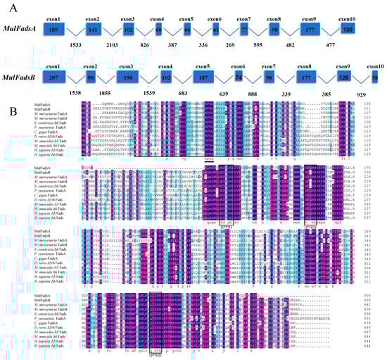 Sequence analysis of Fads. (A) Gene structure of the MulFadsA and MulFadsB of M. lateralis. The blue boxes and polylines indicate the exons and introns, respectively. The numbers in the boxes and under the line indicate the lengths of exons and introns, respectively. (B) Multiple sequence alignment of Fads sequence in M. lateralis. The cytochrome-b5 like domain is underlined with a solid line, the heme-binding motif of HPGG is highlighted with a short bold line, and the three histidine boxes are denoted with frames. An asterisk indicates any amino acid in the domain.