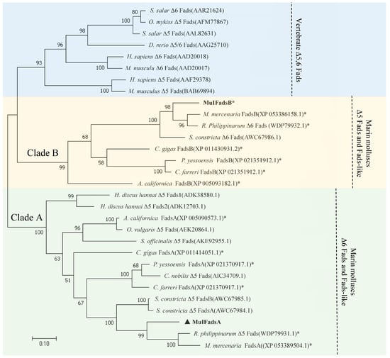An ML phylogenetic tree was constructed using the amino acid sequences of MulFads and Fads members from other species. All the mollusk front-end desaturases were classified into two distinct clades identified as clade A and clade B (Figure 2) according to the nomenclature proposed by Surm et al. [27,28] and Ramos-Llorens et al. [29]. Specifically, clade A contained all functionally characterized Δ5 Fads and Fads-like sequences of other mollusks (not functionally characterized, denoted with *). MulFadsA, together with another two Fads from R. philippinarum and M. mercenaria, were clustered into this clade. Clade B contained more Fads-like sequences of mollusks that were not functionally characterized, except for Δ6 Fads sequences functionally characterized from S. constricta, and MulFadsB were clustered into this clade.