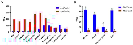 RNA-seq datasets for different developmental stages and adult tissues of M. lateralis were analyzed to detect the spatiotemporal expression patterns of MulFadsA and MulFadsB genes (Figure 3). Specifically, the expression of MulFadsA in the early developmental periods was low, with TPM below X, and then gradually increased from blastula stage (Figure 3A). MulFadsB showed the opposite expression pattern, with high expression levels in eggs and during early developmental periods and low expression levels from the trochophore stage (Figure 3A). During complete developmental stages, MulFadsA showed lower expression levels compared with MulFadsB. In adult tissues of M. lateralis, the overall expression level of MulFadsA was higher than that of MulFadsB. MulFadsA had significantly higher expression levels in the mantle, gonad, and foot compared to the digestive gland (Figure 3B). The expression level of MulFadsB was highest in the gonad, followed by the mantle, digestive gland, and foot (Figure 3B).