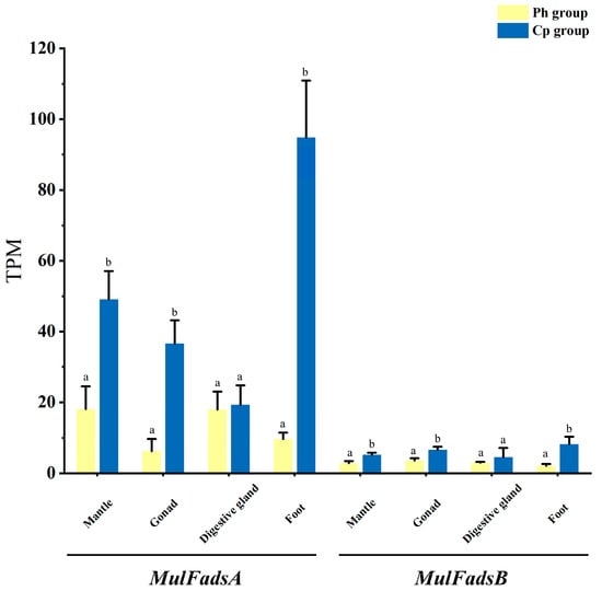 To examine the expression patterns of MulFads genes in response to different unialgal diets, RNA-seq datasets of four tissues from M. lateralis under two types of unialgal diets, including C. pyrenoidosa (Cp) and P. helgolandica (Ph) with a distinct LC-PUFA composition [23], were used for analysis. According to our previous research [24] and a recent study (unpublished), the Cp diet has a positive effect on the growth and fatty acid composition of M. lateralis as compared to the Ph diet. The feeding effects of the two microalgae diets on the expressions of MulFads are shown in Figure 4. Specifically, MulFadsA expression levels were significantly higher in the mantle, gonad, and foot of the Cp group compared to those in the Ph group, while no significant difference was found for the digestive gland between the two groups. MulFadsB showed a similar expression pattern between the two groups but with a notably lower expression level than MulFadsA (Figure 4).